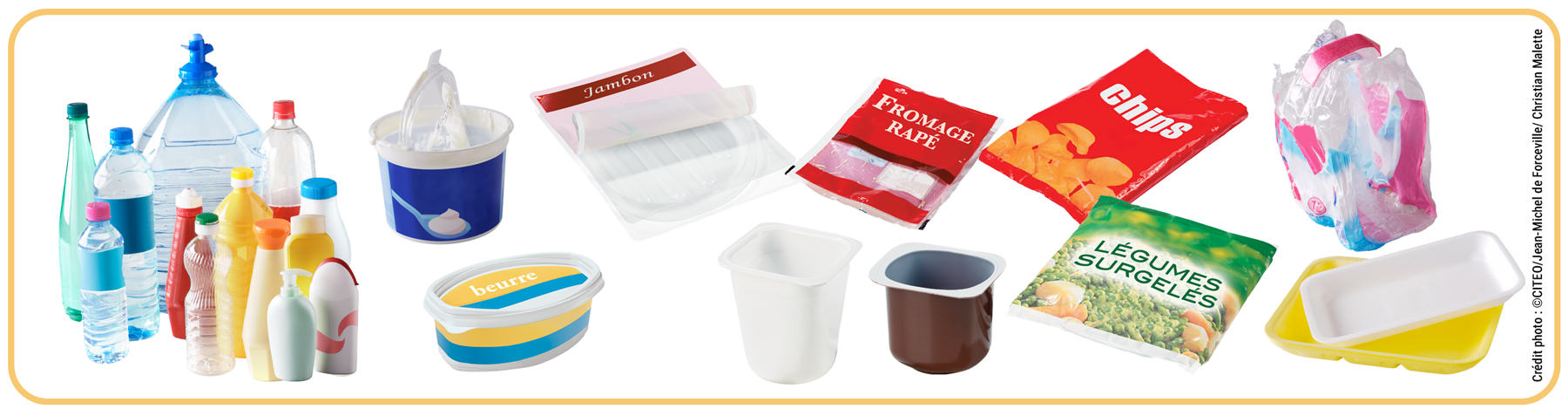 Bouteilles et flaconnages, barquettes et pots, sachets et films en plastique, barquettes en polystyrène